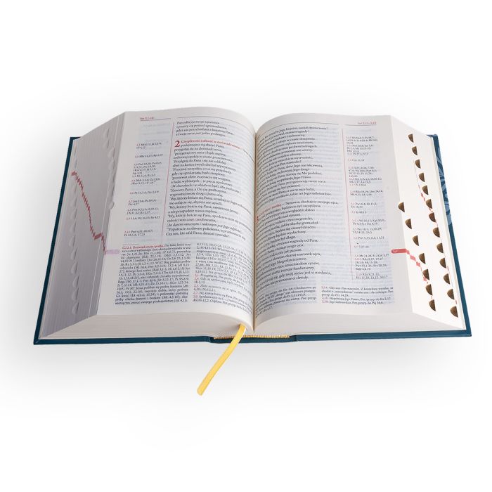 Niniejsze wydanie Pisma Świętego wykończono twardą, turkusową oprawą. Dla jeszcze większej wygody, Biblię wzbogacono o paginatory – specjalne zakładki ułatwiające wyszukiwanie fragmentów Słowa Bożego. Na naszej stronie znajdziesz również inne warianty okładki: twardą turkusową oraz płócienną czerwoną – każda w wersji z paginacją i bez niej.