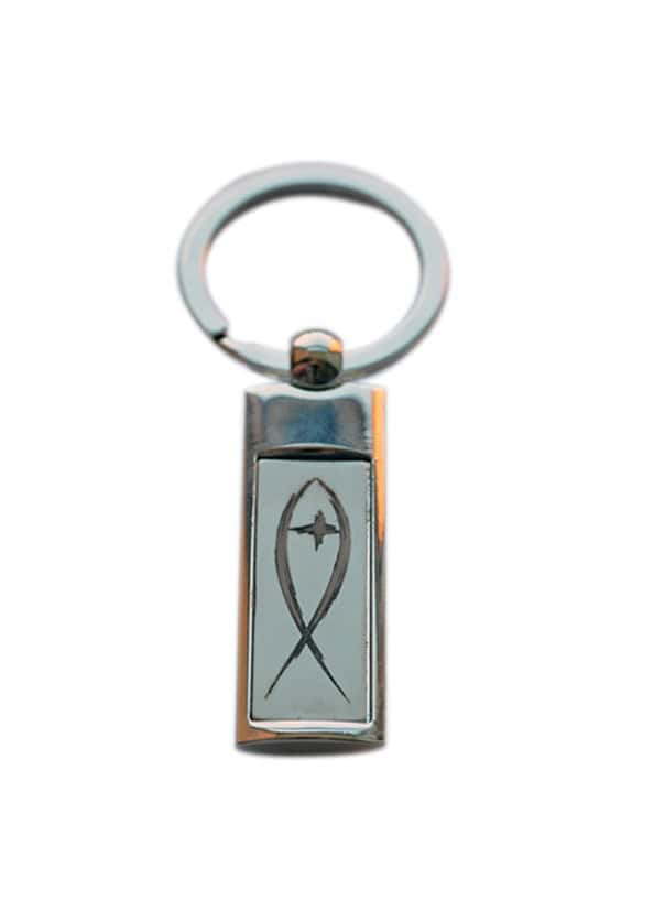 Breloczek metalowy z grawerowanym obrazkiem ryby.
