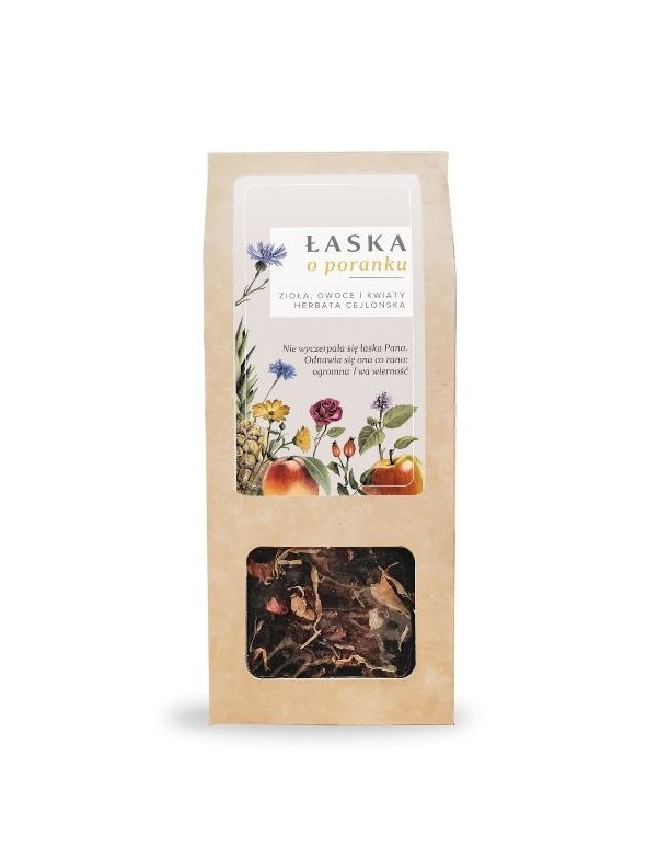 Herbata cejlońska z ziołami, owocami i kwiatami. Łaska o poranku to kompozycja smakowa, kórej łyk o poranku ma przypomnieć ci o tym, ze co rano odnawia się potężna Boża wierność.