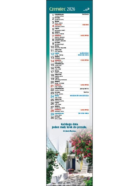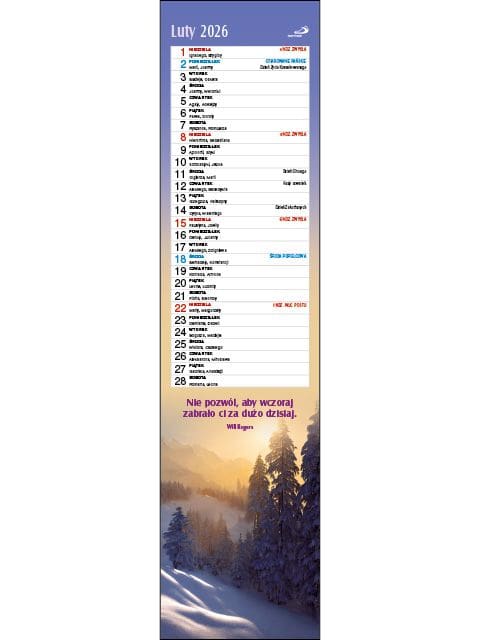 Kalendarz wyróżnia oryginalny, praktyczny format – 10,50 x 42,00 cm, dzięki któremu powiesisz go nawet na niewielkiej przestrzeni.