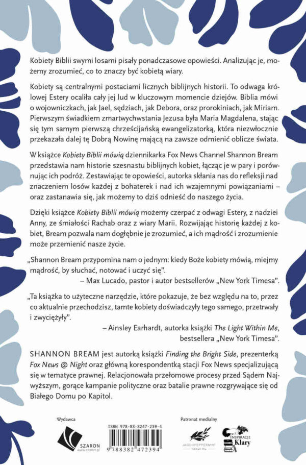 W książce Kobiety Biblii mówią dziennikarka Fox News Channel Shannon Bream przedstawia nam historie szesnastu biblijnych kobiet, łącząc je w pary i porównując ich podróż. Zestawiając te opowieści, autorka skłania nas do refleksji nad znaczeniem losów każdej z bohaterek i nad ich wzajemnymi powiązaniami – oraz zastanawia się, jak możemy to dziś odnieść do naszego życia.