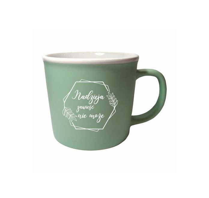 Kubek w kolorze zielonym z białym nadrukiem.