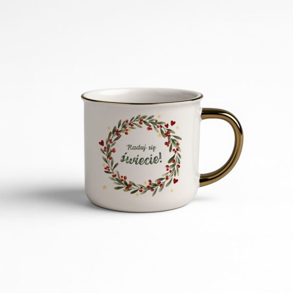 Kubek wykonany jest z wysokiej jakości ceramiki w kolorze białym i ozdobiony złotym rantem oraz złotym uchwytem, co nadaje mu wyjątkowego blasku. Przód kubka zdobi piękny, ręcznie ilustrowany świąteczny wieniec z napisem: