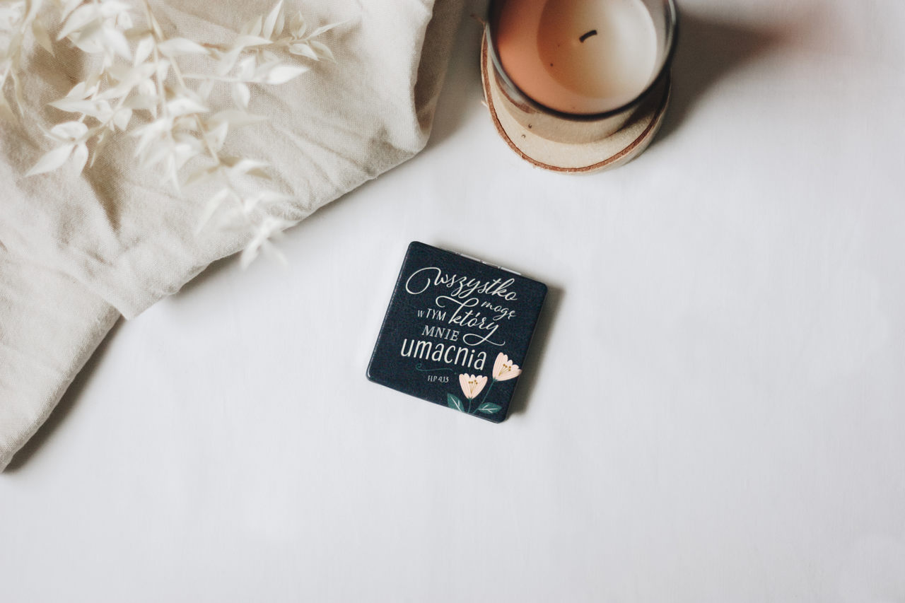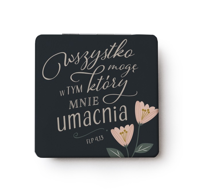 Kwadratowe lusterko kieszonkowe z fragmentem ze Słowa Bożego “Wszystko mogę w tym który mnie umacnia.” Filipian 4,13