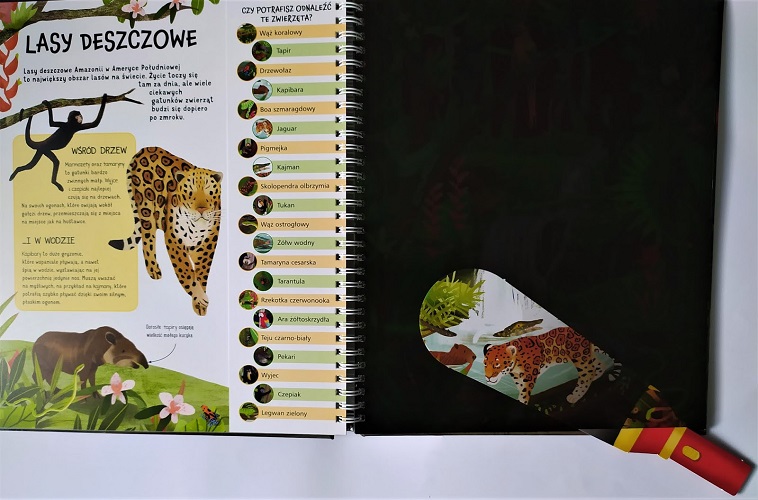 Wypchnij znajdującą się w książce kartonową „latarkę”, weź ją do ręki i wsuń między arkusz folii a stronę poniżej. Zobaczysz, jak niesamowicie wygląda przyroda nocą. Zaciemnione strony w tej książce ukrywają sceny pełne zwierząt. Dzika dżungla, afrykańska sawanna, skute lodem wybrzeże… Każda scena pokazuje inne środowisko. Wystarczy przesunąć latarkę, aby rzucić światło na żyjące tam wspaniałe stworzenia.